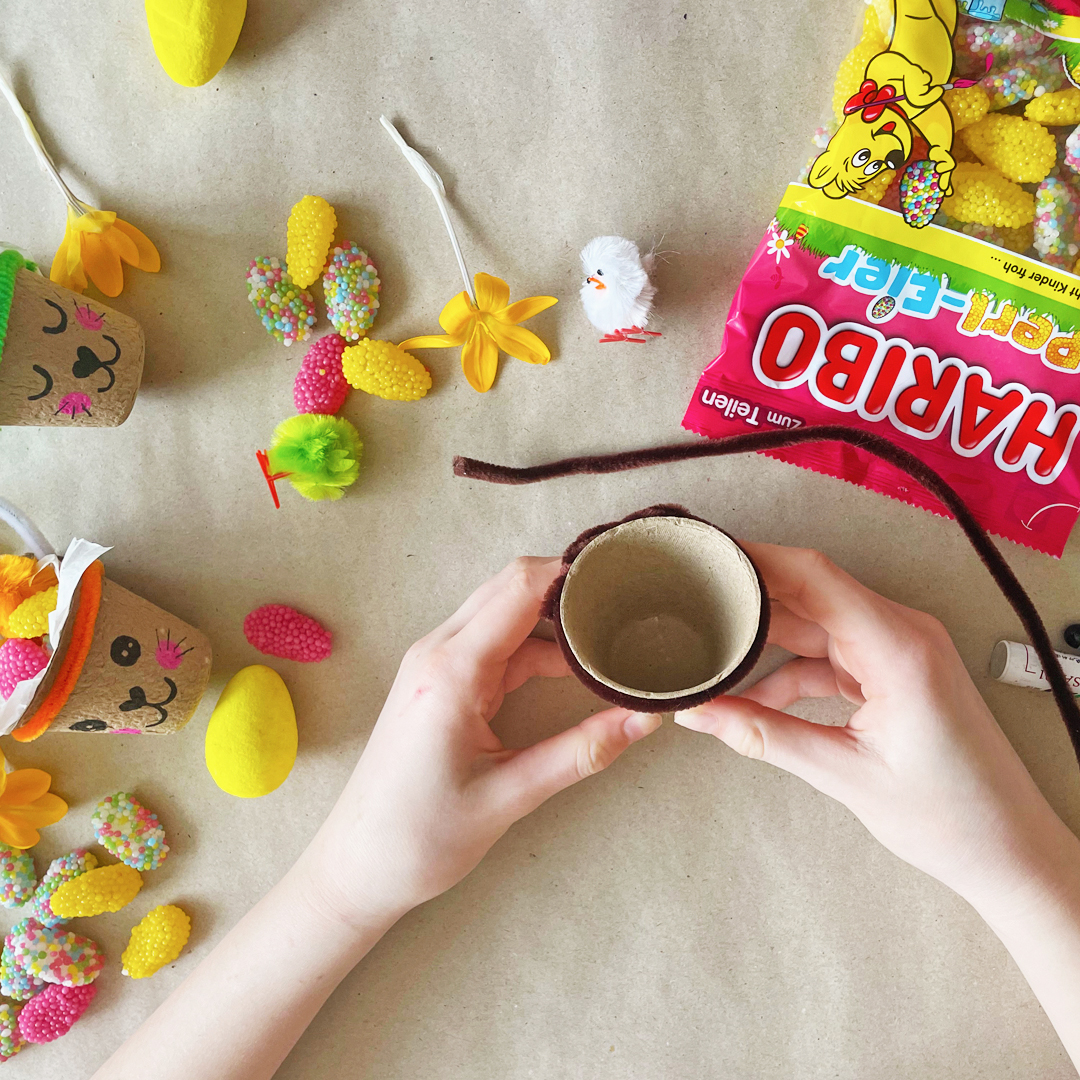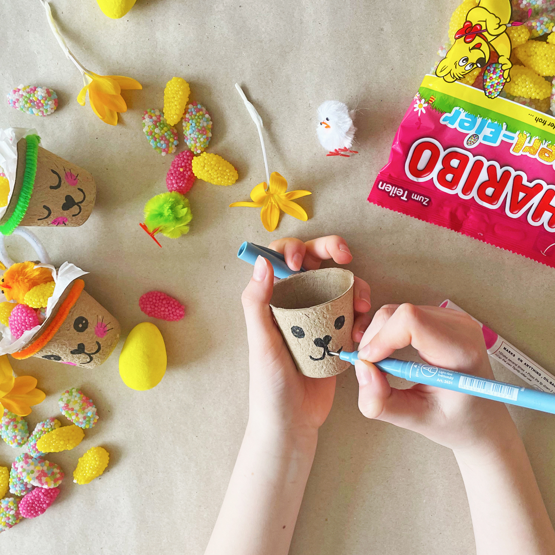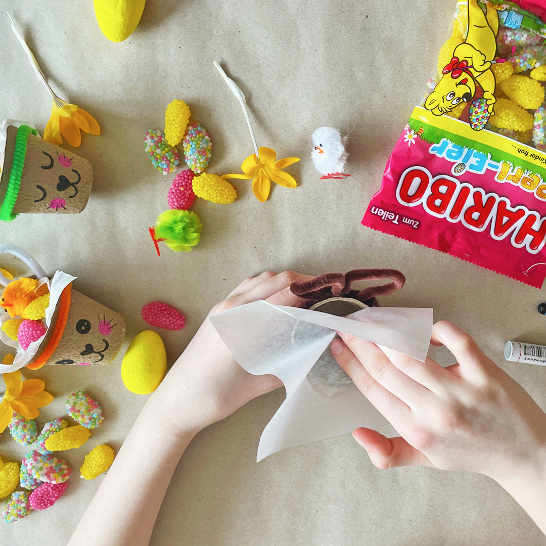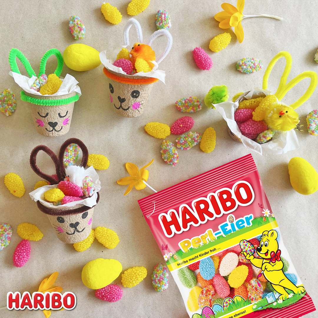 5. Teraz už stačí len naplniť pohárik cukrovinkami Haribo Perl-Eier a ozdobiť ho veľkonočným kuriatkom a vaša sladká veľkonočná dekorácia je hotová.