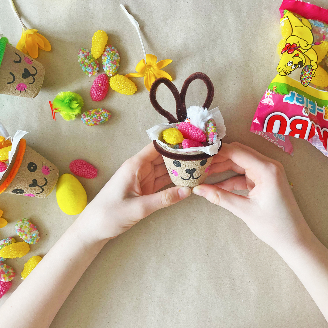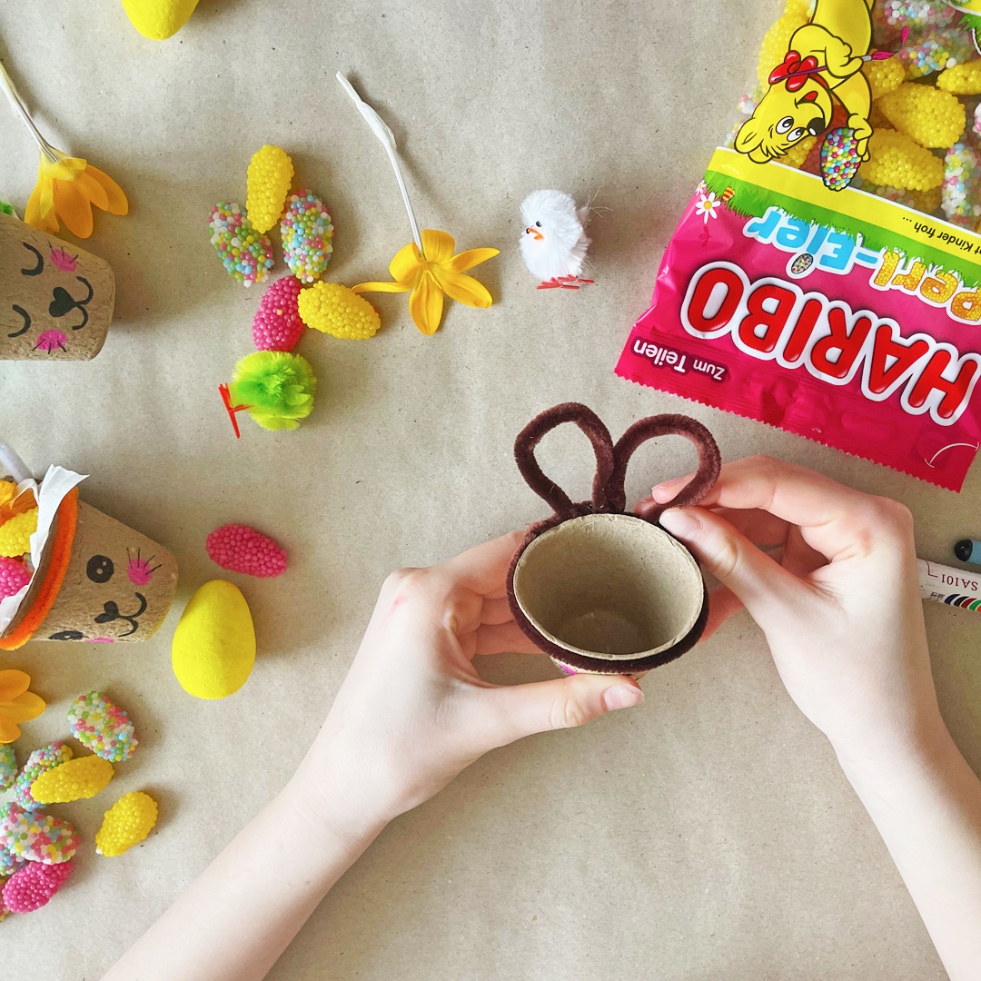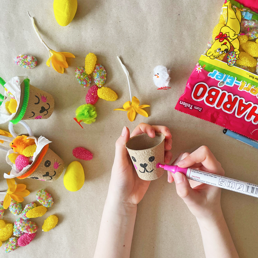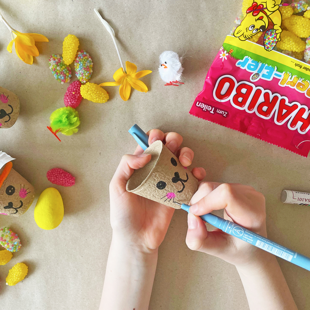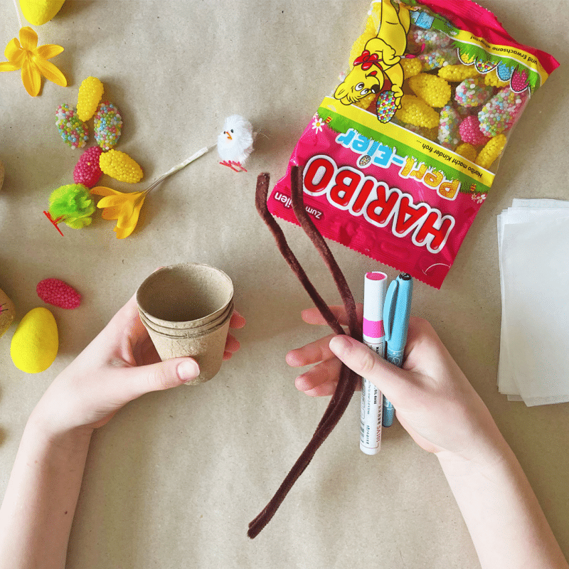 5. Teraz už stačí len naplniť pohárik cukrovinkami Haribo Perl-Eier a ozdobiť ho veľkonočným kuriatkom a vaša sladká veľkonočná dekorácia je hotová.