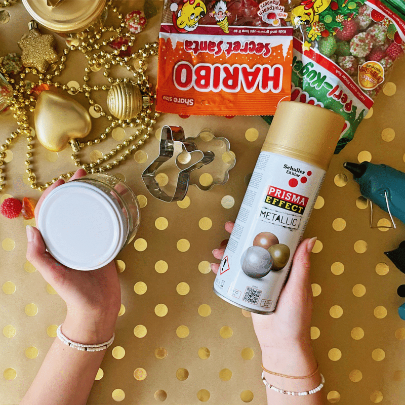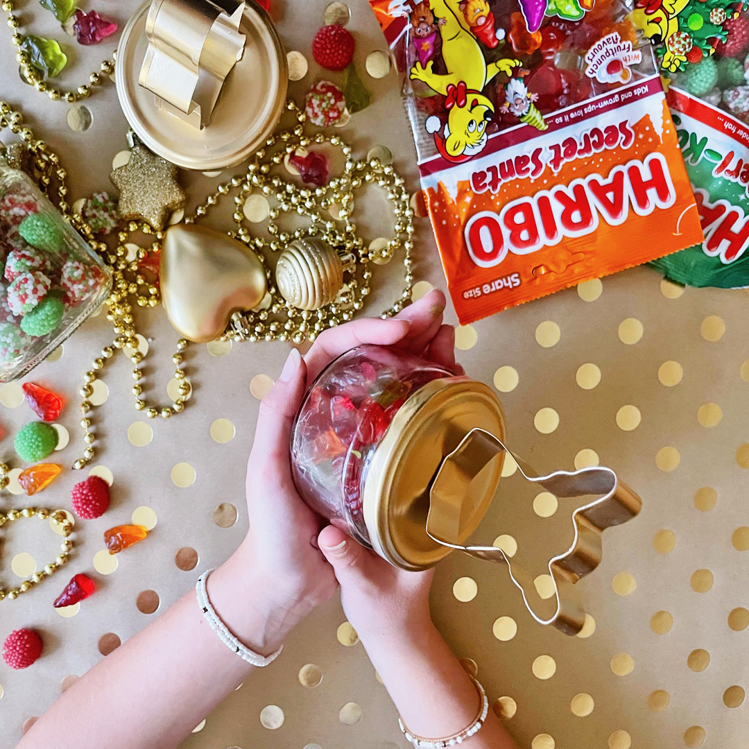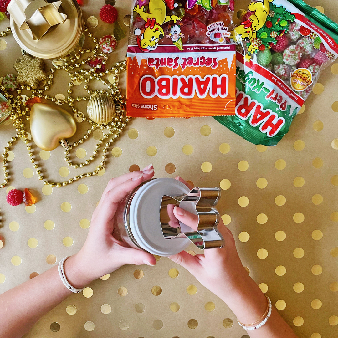 5. Počas schnutia naplňte pohár svojimi obľúbenými cukrovinkami. My sme zvolili vianočné príchute HARIBO Secret Santa alebo Perl-Kugeln.