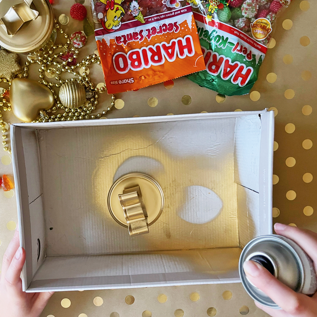 3. Viečko vložte do krabice a nastriekajte ho zlatou farbou.